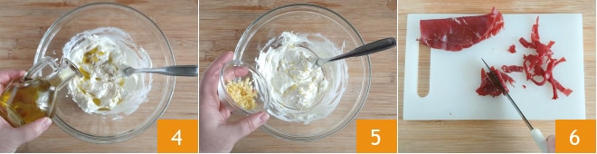 et un filet d'huile d'olive 4. Enfin, assaisonnez avec une partie des zestes hachés 5, conservez le reste pour garnir les plats au moment de servir. Coupez en fines lanières les tranches de bresaola 6. Réservez-en quelques-unes,