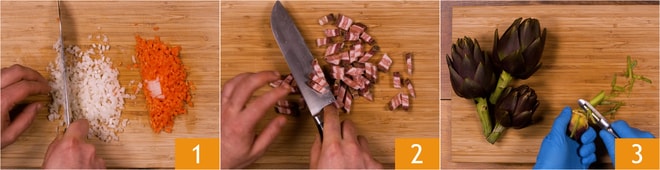 Pour préparer les pâtes savoureuses aux artichauts, commencez par hacher des carottes et des oignons 1. Ensuite, coupez le lard en lanières 2 et réservez-le. Maintenant, nettoyez les artichauts : retirez les feuilles extérieures jusqu'à atteindre celles plus claires à l'intérieur, puis coupez la pointe de l'artichaut pour enlever toutes les épines présentes sur la pointe des feuilles. Coupez la tige en laissant quelques centimètres et épluchez-la avec un économe 3.