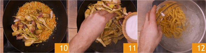 Lorsque les légumes commencent à ramollir, ajoutez aussi les artichauts 10, assaisonnez de sel 11 et laissez-les cuire à feu toujours assez vif pendant encore 6-7 minutes. À ce stade, l'eau aura atteint l'ébullition, ajoutez le sel et plongez les pâtes 12 que vous devez cuire al dente.