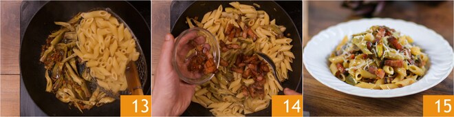 Égouttez ensuite les pâtes, transférez-les dans la poêle avec les artichauts et mélangez bien 13. Ajoutez une louche d'eau de cuisson si nécessaire et ajoutez les lardons croustillants 14. Servez vos pâtes savoureuses aux artichauts en ajoutant du parmesan râpé.