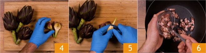Coupez les artichauts en quartiers 4 et retirez le foin à l'intérieur 5. Transférez progressivement les artichauts dans de l'eau acidulée pour éviter qu'ils ne noircissent. Une fois tous les artichauts préparés, faites revenir le lard coupé en lanières dans une belle grande poêle 6. Pendant ce temps, mettez aussi sur le feu une casserole d'eau que vous porterez à ébullition pour la cuisson des pâtes.