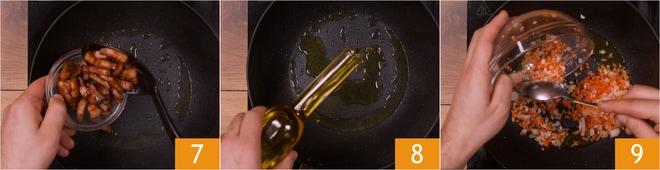 Lorsque le lard est bien grillé, retirez-le de la poêle et transférez-le dans un petit bol 7. Versez un filet d'huile dans la même poêle 8 et le hachis de légumes 9. Faites revenir pendant 5 minutes.