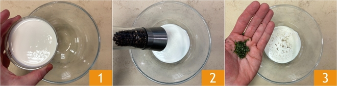 Pour réaliser le pavé de pommes de terre avec sauce tzatziki, commencez par verser la crème fraîche dans un bol 1, puis assaisonnez avec du sel, du poivre 2 et du thym 3.