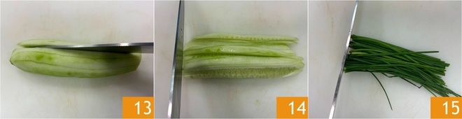 Pour préparer la sauce tzatziki, épluchez le concombre et coupez-le d'abord en tranches 13 puis en petits dés 14. Ciselez finement la ciboulette 15.