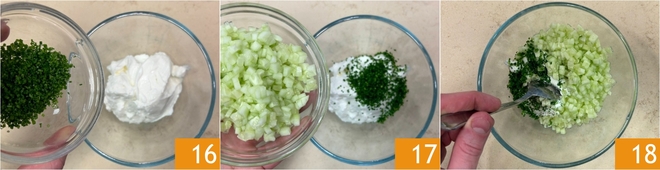 Versez le yaourt grec dans un bol, puis ajoutez le concombre 16 et la ciboulette 17, du sel et du poivre. Mélangez pour bien amalgamer le tout 18.