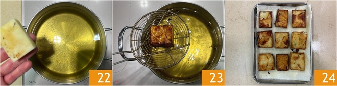 Chauffez l'huile de tournesol à 180°, puis immergez 1-2 cubes à la fois à l'aide d'une écumoire 22 et faites frire jusqu'à ce qu'ils soient dorés. Égouttez 23 et transférez sur du papier absorbant 24.