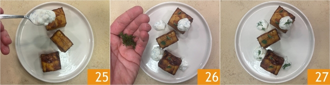 Disposez dans l'assiette en garnissant les cubes de petites pointes de sauce tzatziki 25, de sel maldon et de quelques feuilles de marjolaine 26. Votre pavé de pommes de terre avec sauce tzatziki est prêt à être servi 27!