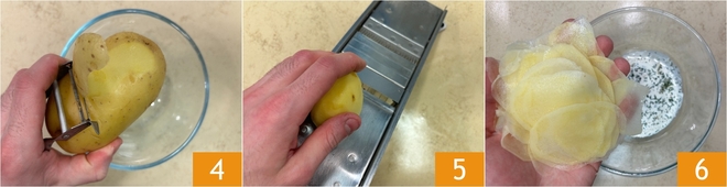 Épluchez les pommes de terre 4 et tranchez-les finement avec une mandoline 5 ; vous devez obtenir des tranches de 1 mm d'épaisseur. Ajoutez les pommes de terre dans le bol avec la crème 6.