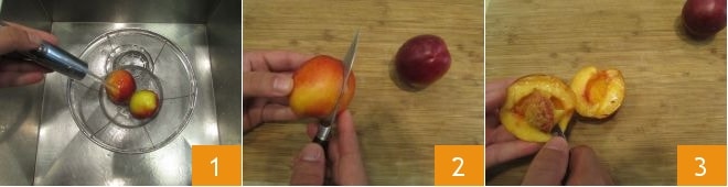 Pour préparer les pêches caramélisées, commencez par préchauffer le four statique à 180°, puis passez aux pêches : lavez-les 1, coupez-les en deux 2 et retirez le noyau en l'incisant avec un petit couteau 3.