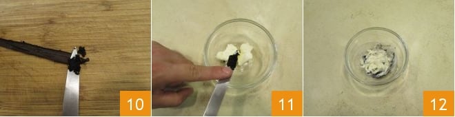 Pendant que le caramel cuit, mettez dans un petit bol le beurre en morceaux à température ambiante. Puis, avec un couteau, récupérez les graines de la pointe de la gousse de vanille 10 et ajoutez-les au beurre 11, en travaillant le tout avec une cuillère pour bien amalgamer 12.