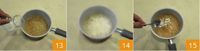 Lorsque le caramel est devenu couleur ambre, retirez la casserole du feu et, en mélangeant avec le fouet, ajoutez la crème en filet, en faisant attention car cela va mousser beaucoup (13-14). Continuez à mélanger la crème dans le caramel, puis ajoutez également le beurre parfumé à la vanille 15.
