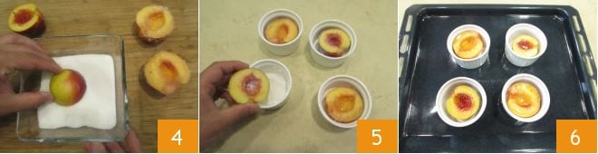 Plongez les demi-pêches dans le sucre, côté chair 4, puis disposez-les dans les cocottes 5 et transférez-les sur une plaque ou un plat allant au four 6 ; ensuite, faites-les cuire dans le four préchauffé à 180° pendant 25 minutes 6.