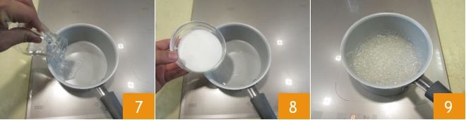 En attendant, occupez-vous du caramel : dans une casserole large, versez l'eau 7 et ajoutez le sucre 8. Sans mélanger, allumez le feu et faites bouillir le mélange d'eau et de sucre 9 jusqu'à obtenir une belle couleur ambrée.