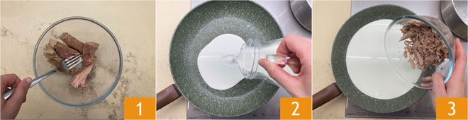 Pour préparer les penne au baffo avec du thon, commencez par égoutter et émietter les filets de thon dans un bol 1. Versez la crème fraîche 2 et le thon 3 dans une grande poêle antiadhésive.