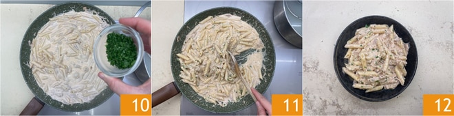 À la fin, éteignez le feu et ajoutez le persil 10. Mélangez bien 11 et ajustez si nécessaire le sel et le poivre. Servez les penne au baffo avec du thon chaudes avec une pincée de persil et une râpée de poivre 12.