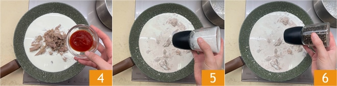 Ajoutez également la purée de tomates 4, du sel 5 et du poivre 6 et laissez cuire à feu doux pendant environ 10 minutes, en remuant de temps en temps.