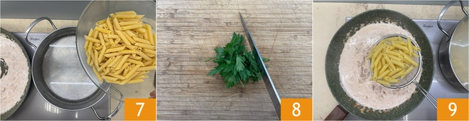 Faites bouillir les pâtes dans une grande quantité d'eau salée à votre goût 7, en les égouttant deux minutes avant la fin de la cuisson dans la poêle avec la sauce. Pendant ce temps, hachez le persil 8. Égouttez les pâtes et faites-les sauter dans la poêle 9. Terminez la cuisson en ajoutant quelques louches d'eau si nécessaire.
