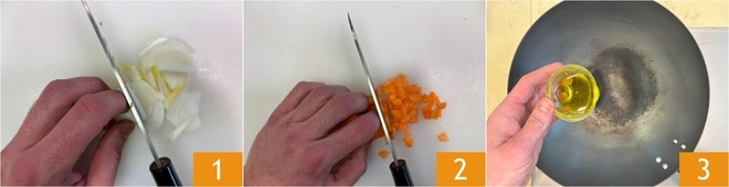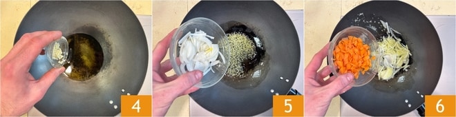 Ajoutez dans le wok l'ail épluché et finement haché 4, l'oignon tranché 5 et les carottes hachées 6.
