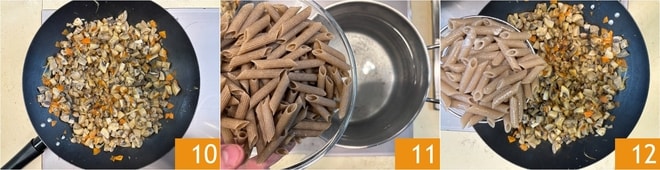 Continuez à cuire à feu moyen haut en remuant souvent pour éviter que les ingrédients à la base du wok ne brûlent 10. Faites cuire les penne au sarrasin dans de l'eau bouillante salée 11, une fois prêtes, égouttez-les et transférez-les dans le wok 12.