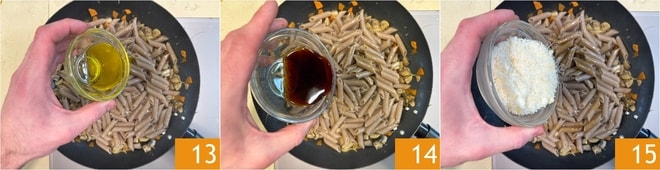 Pour finir, versez l'autre moitié de l'huile 13, la sauce soja sans gluten 14 et le parmesan râpé 15.