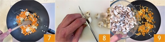 Maintenez la température moyenne haute et mélangez fréquemment à l'aide d'une cuillère 7. Comment nettoyer les cèpes et coupez-les en morceaux 8, puis transférez-les dans la poêle avec le reste de l'assaisonnement 9.