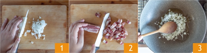 Pour préparer les penne à la vodka, commencez par nettoyer un oignon et le couper finement 1. Coupez également le bacon fumé en cubes 2. Dans une poêle, versez l'huile, ajoutez l'oignon 3 et faites-le revenir pendant 5 minutes.