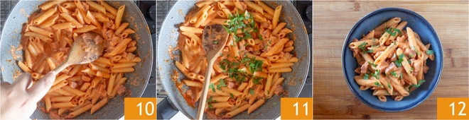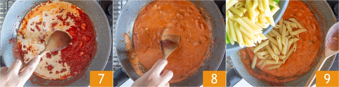 Ajoutez la crème à la sauce 7, mélangez bien 8 et laissez réduire la sauce pendant encore 5 à 7 minutes. Égouttez les penne al dente et transférez-les dans la poêle 9.