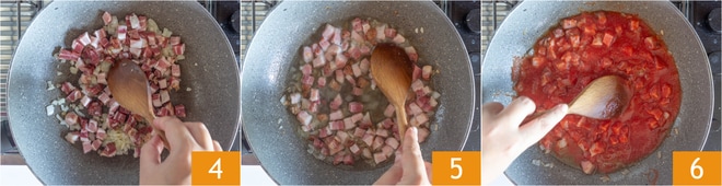 Ajoutez le bacon et faites-le dorer pendant 5 minutes 4. Déglacez avec la vodka 5 et laissez s'évaporer toute la partie alcoolique à feu moyen. Versez ensuite la purée de tomates 6 et faites cuire à feu doux pendant 10 minutes. Pendant ce temps, faites cuire les penne dans de l'eau bouillante salée.