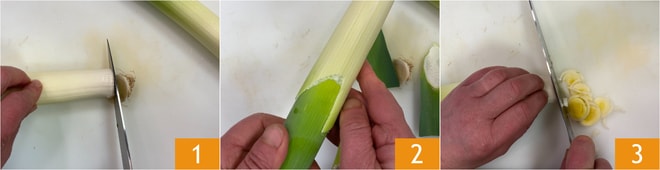 Pour préparer les penne au safran véganes, commencez par couper les racines des poireaux 1, retirez la première couche la plus dure 2, puis coupez-les en rondelles 3.