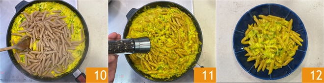 Mélangez pour amalgamer les ingrédients 10 et terminez la cuisson, si nécessaire ajoutez plus d'eau de cuisson des pâtes. Ajustez le sel et le poivre 11, puis servez. Les penne au safran véganes sont prêtes à être dégustées 12.