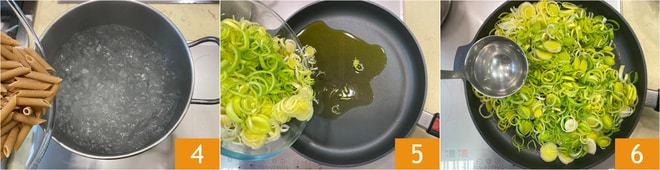 Faites cuire les pâtes dans une grande quantité d'eau bouillante salée 4 pendant le temps indiqué sur l'emballage. Dans une poêle, versez l'huile, ajoutez les poireaux 5 et une louche d'eau de cuisson des pâtes 6. Faites cuire pendant 10 minutes.