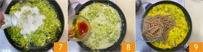 Versez la crème de soja dans la poêle 7 et poursuivez la cuisson pendant encore 5 minutes. Dissolvez les sachets de safran avec une louche d'eau de cuisson des pâtes, ajoutez-les aux poireaux 8 et mélangez. Égouttez les pâtes al dente et transférez-les dans la poêle 9.