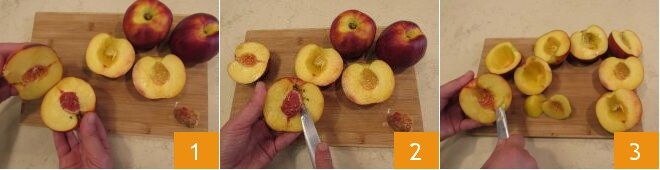 Pour préparer les pêches farcies au four, commencez par rincer et sécher les pêches. Coupez chaque pêche en deux 1, puis avec un petit couteau, retirez le noyau 2. Creusez également un peu la chair autour de l'emplacement du noyau 3. Mettez les pêches de côté.