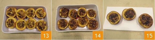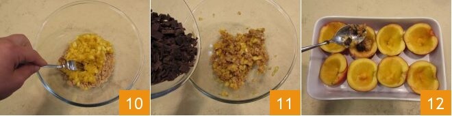 Mélangez les ingrédients 10 à l'aide d'une fourchette. Puis ajoutez également le chocolat 11 et mélangez ce dernier aux ingrédients. Enfin, disposez dans un plat légèrement beurré les pêches côte à côte avec l'ouverture vers le haut, de préférence sans laisser d'espaces. Remplissez-les de quelques cuillères de farce, en donnant à la farce la forme d'une petite coupole 12.