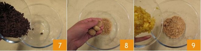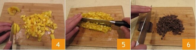 Maintenant, occupez-vous de la farce : découpez la chair des pêches récupérées 4 et hachez-la avec un couteau 5 ou en utilisant un mixeur. Mettez de côté. Prenez le chocolat et hachez-le finement 6.