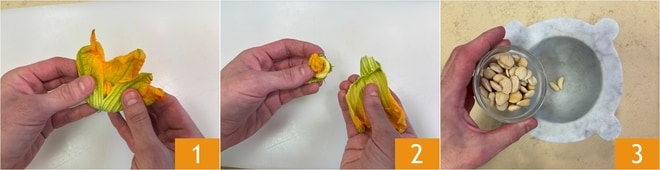 Pour préparer le pesto aux fleurs de courgette, commencez par nettoyer les fleurs avec un pinceau ou un chiffon légèrement humide, puis ouvrez-les 1 et retirez le pistil intérieur 2. Dans un mortier, mettez la gousse d'ail épluchée et les amandes 3.