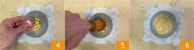 Ajoutez une pincée de sel 4 et écrasez avec le pilon 5 jusqu'à obtenir une consistance fine 6.