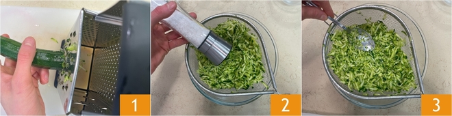 Pour préparer le pesto de courgettes et amandes, commencez par laver et couper les extrémités des courgettes, puis râpez-les avec une râpe à gros trous 1. Transférez les courgettes dans une passoire, salez-les 2 et pressez-les avec une cuillère. Laissez reposer les courgettes pendant 20 minutes pour éliminer l'eau de végétation 3.
