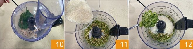 Mixez 10 jusqu'à obtenir une consistance grossière. Incorporez maintenant le Parmigiano Reggiano râpé 11 et les courgettes égouttées 12.