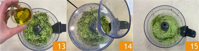 Versez l'huile d'olive extra vierge 13 et remettez le mixeur en marche quelques secondes 14. Vous devez obtenir une texture rustique mais homogène 15.