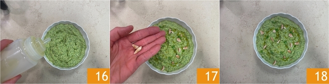Complétez le pesto d'un filet d'huile d'olive extra vierge 16 et des amandes réservées 17. Votre pesto de courgettes et amandes est prêt à être servi 18 !