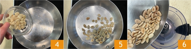 Pendant ce temps, versez dans une poêle chaude les amandes émondées 4 et faites-les torréfier à feu moyen pendant environ 7 minutes, en remuant souvent pour éviter qu'elles ne brûlent 5. Transférez les amandes torréfiées dans un mixeur équipé de lames 6, en prenant soin d'en réserver quelques-unes pour la décoration.