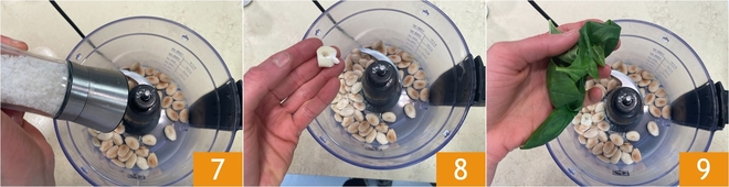 Ajoutez le sel 7, la gousse d'ail épluchée et dégermée 8 et le basilic frais 9.