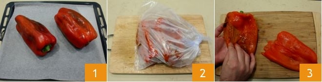 Pour préparer le pesto de poivrons, commencez par la cuisson des poivrons au four pour faciliter l'élimination de la peau : placez les poivrons rouges entiers précédemment lavés sur une plaque recouverte de papier sulfurisé; faites-les cuire dans un four statique préchauffé à 220° pendant 20-25 minutes. Une fois cuits 1, enfermez-les dans un sac alimentaire 2 pendant au moins 15 minutes, puis pelez-les 3
