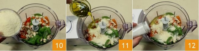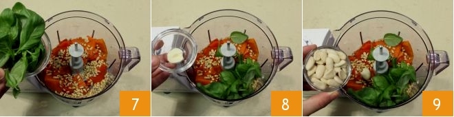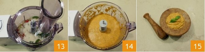 puis actionnez le mixeur 13 et mixez le tout jusqu'à obtenir un mélange homogène 14. Votre pesto de poivrons est prêt à être utilisé 15 comme condiment pour des plats de pâtes ou à accompagner avec du pain grillé.