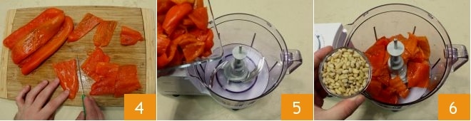 retirez le pédoncule et les graines internes et coupez les lobes en deux 4. Mettez les poivrons dans le mixeur 5, ajoutez également les pignons 6