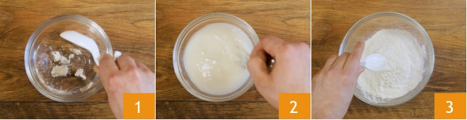 Pour préparer les petites bombes de pizza aux aubergines, commencez par la pâte. Dans un petit bol, versez l'eau à température ambiante et la levure 1. Mélangez jusqu'à dissolution complète 2 et mettez de côté un moment. Dans un autre bol plus grand, versez la farine et le sel 3.