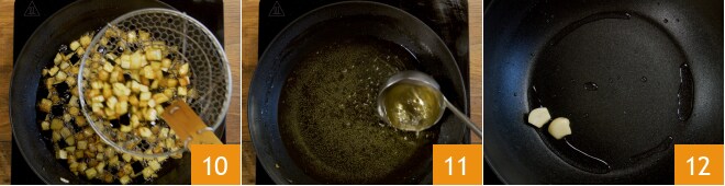 Portez l'huile d'arachide à température dans une poêle (170° seront parfaits). Plongez les aubergines dans l'huile bouillante et laissez-les frire légèrement, à feu moyen. Dès que les aubergines commencent à dorer, égouttez-les 10 et laissez éliminer l'excès d'huile. Mettez-les de côté. Dans la même poêle où vous venez de frire les aubergines, laissez seulement environ 2 cuillères à soupe d'huile, en éliminant le reste avec une louche 11, sans vous brûler. Aromatisez l'huile avec une gousse d'ail coupée en deux 12;
