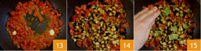 quand l'ail commence à crépiter, ajoutez les tomates coupées en morceaux dans la poêle 13. Laissez chauffer et faites cuire pendant 2-3 minutes, puis ajoutez à nouveau les aubergines frites dans la poêle 14. Mélangez et laissez bien s’imprégner et amalgamer le tout. Ajoutez les feuilles de basilic 15 et ajustez le sel.
