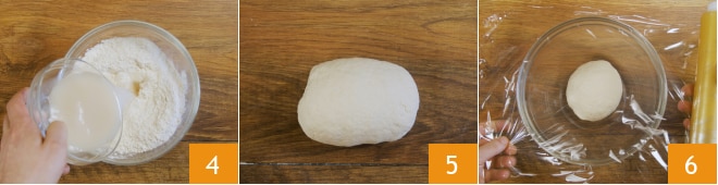 Ajoutez également l'eau dans laquelle vous avez dissous la levure 4 et travaillez la pâte. Si vous préférez, vous pouvez utiliser un robot pâtissier, sinon vous pouvez pétrir à la main directement dans le bol jusqu'à obtenir une pâte homogène. Transférez-la ensuite sur un plan de travail et pétrissez encore quelques instants jusqu'à ce qu'elle soit lisse 5. Si vous préférez, vous pouvez utiliser le robot pâtissier, équipé d'un crochet, à vitesse moyenne-basse, jusqu'à obtenir une pâte lisse. Transférez dans un bol, scellez bien avec du film plastique et laissez lever la pâte dans un four éteint, seulement avec la lumière allumée, jusqu'à ce qu'elle double de volume. Cela prendra environ 2-3 heures.